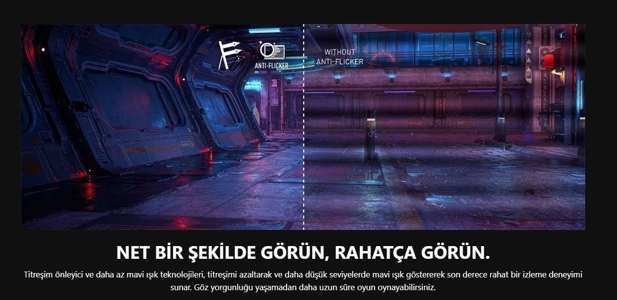 Titreşim önleyici ve daha az mavi ışık teknolojileri, titreşimi azaltarak ve da düşük seviyelerde mavi ışık göstererek son derece rahat bir izleme deneyimi sunar. Göz yorgunluğu yaşamadan daha uzun süre oyun oynayabilirsiniz.