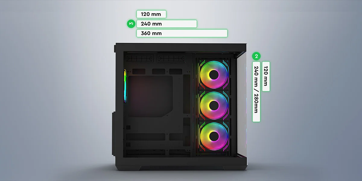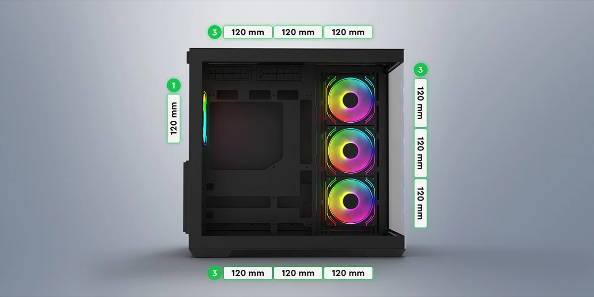Warcry Prism, geliştirilmiş soğutma performansı için üstün hava akışı sağlar; 10 fan’a kadar kurulum, mükemmel bir soğutma sirkülasyonu oluşturur.