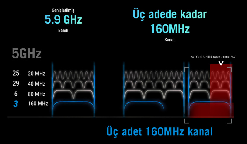 WiFi 6 UNII-4 destekli mesh sistemi ve UNII-4 olmayan mesh sisteminin karşılaştırılmasıyla ölçülmüştür.