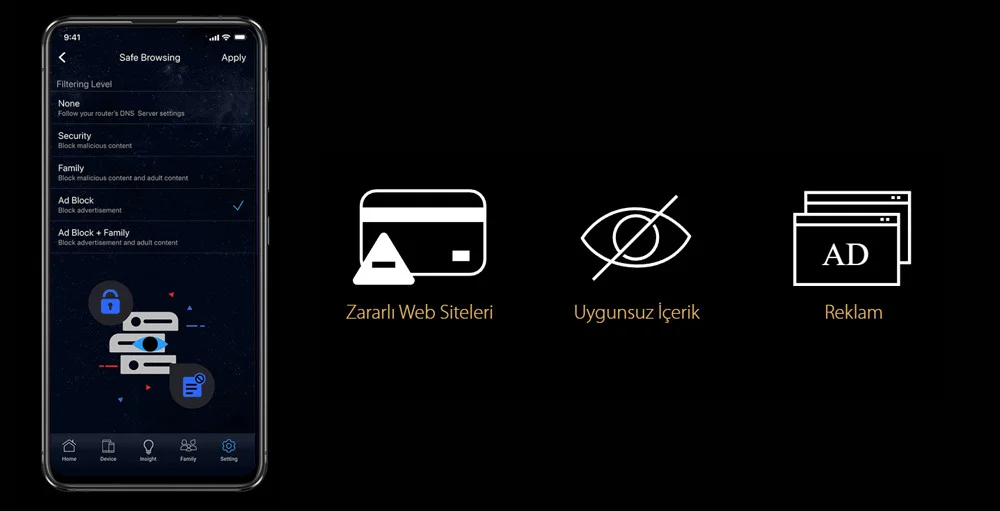 İnternet; uygunsuz içerikler, araya giren reklamlar, güvenlik riskleri ve daha farklı tehlikeler içerebilir. ASUS Safe Browsing, ekstra bir uygulamaya gerek duymadan tek tıkla istenmeyen içeriklerin engellenmesini sağlar. Düşük bant genişliği kullanan DNS tabanlı filtrelemesi* router performansınızı etkilemez. Ayrıca, arama sonuçlarında çıkan istenmeyen içerikleri de filtreleyerek çocuklarınızı internetin tehlikelerinden korur.*Safe Browsing kullanarak, engellenen ve filtrelenen içerik standardının üçüncü taraf bir DNS sağlayıcısı tarafından belirlendiğini onaylamış ve kabul etmiş olursunuz.