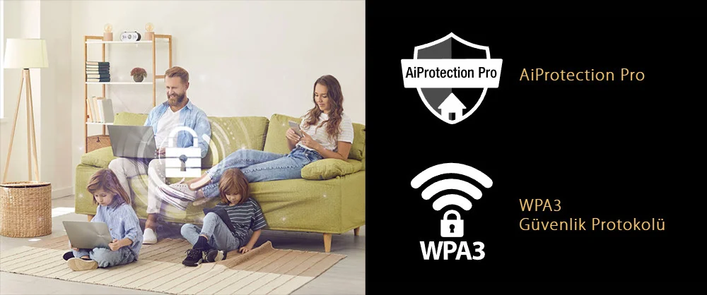 ASUS RT-AX5400’de en yeni WPA3 güvenlik protokolünün yanı sıra cihazlarınızı ve kişisel verilerinizi internet tehditlerine karşı korumak için düzenli ve otomatik olarak güncellenen güvenlik imzalarına sahip Trend Micro™ destekli AiProtection Pro bulunur.AiProtection Pro