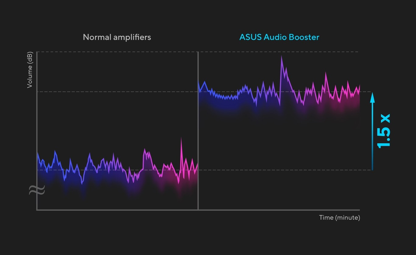 ASUS Audio Booster, ses seviyesini 1,5 kata kadar artırmak ve ses deneyiminizi bir sonraki seviyeye taşımak için benzersiz ses algoritmaları kullanır.