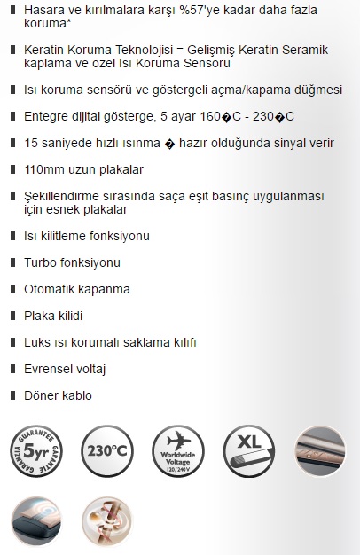 Saçınıza üstün koruma sağlayan Keratin Therapy Pro Düzleştirici ile saçınız için endişelenmeden şekil vermeye hazırlanın! Gelişmiş Keratin Seramik plakalar ve özel Isı Koruma sensörüne sahip bu üstün düzleştirici, nem seviyesini tespit ederek saçınıze en uygun ısı seviyesini ayarlar. Sonuç; daha sağlıklı, daha güçlü, hasara ve kırılmalara karşı %57'ye kadar daha korumalı saçlar